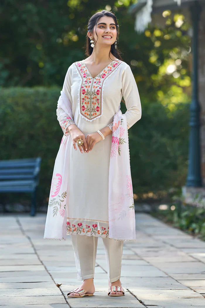 The White Embroidered Chinon Solid Straight Kurta with Dupatta Set is a bold and elegant outfit crafted from lightweight Chinon fabric. Featuring subtle embroidery and a sleek straight-cut silhouette, it offers a modern twist to traditional wear. The vibrant neon shade adds a striking touch, perfect for festive events or special occasions.