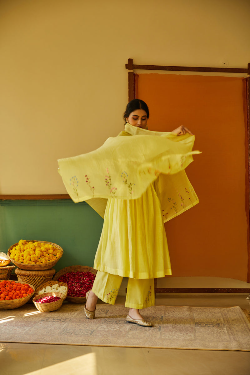"Pastel Yellow Kurta Set" made of handwoven chanderi fabric, featuring a V neckline, delicate gathers, and hand-embroidered colorful flowers on the yoke, sleeve edges, and pant edges.