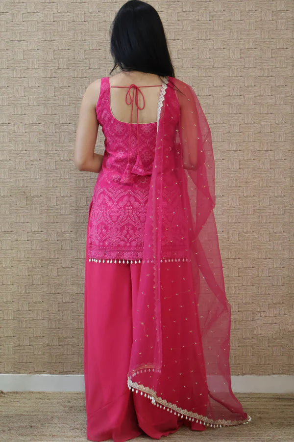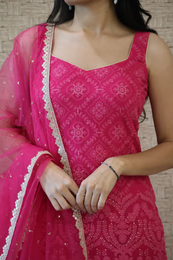 Fabric : Bottom - Georgette, Top - Georgette, Dupatta - NetColor : PinkWork : Machine EmbroideryClosure : Hooks and ZipperCare : Dry clean
